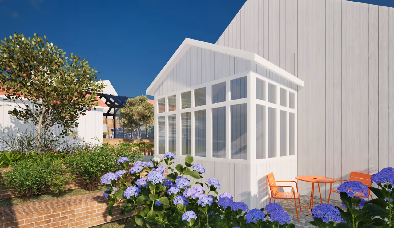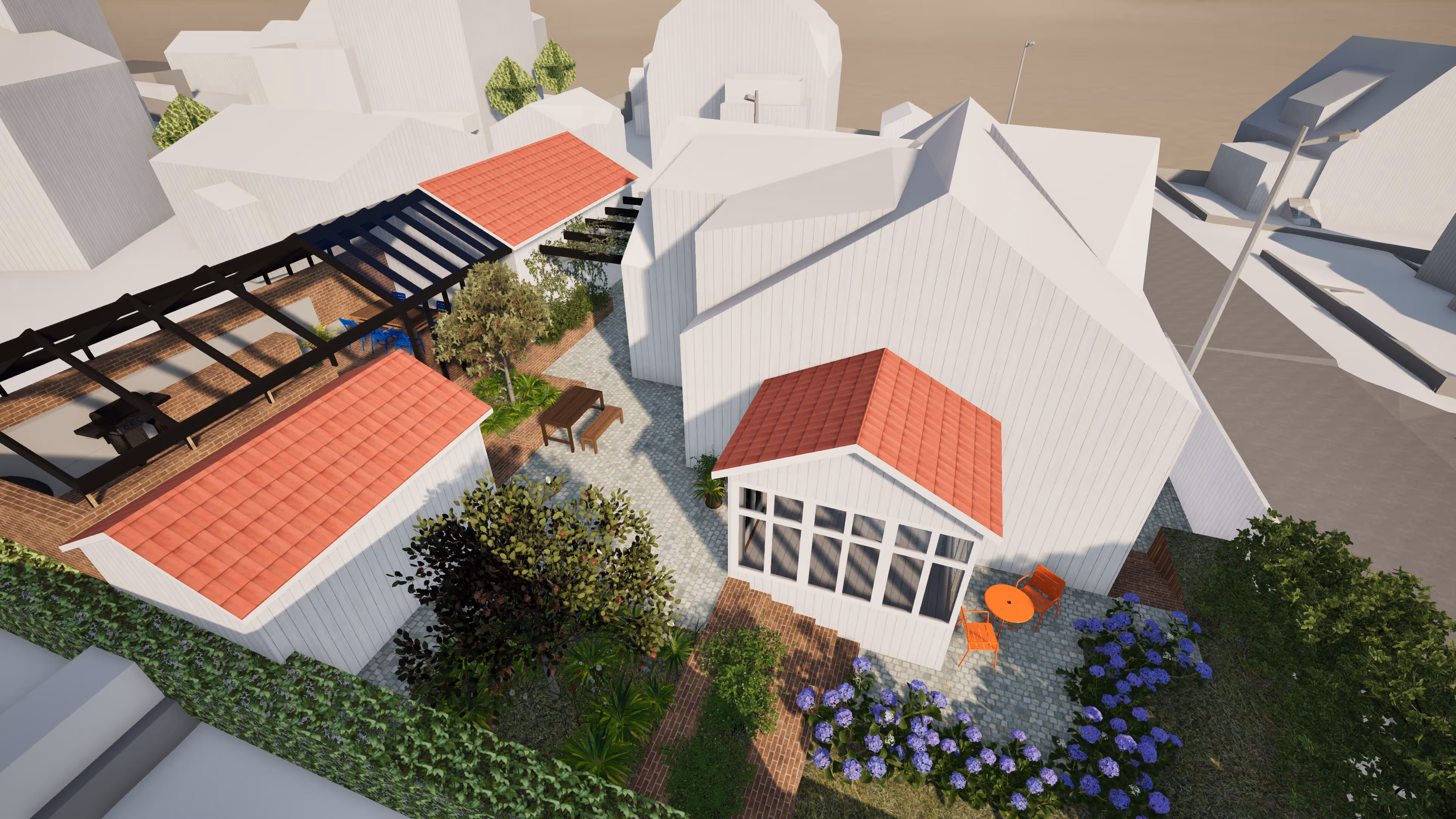 Vi har foreslått å legge et lite tilbygg med utgang fra stue til hagen som passer til husets stil. Utgangen går ut til en ny terrasse og gangvei ut til gårdsplassen. I sørvestre del av hagen er det foreslått et lysthus/ drivhus. Det å legge det i enden av hagen skaper vi et tun følelse som rammer inn by-hagen som nå kan minne om et gammelt gårdsrom. Hagen som i dag er særdeles skrå er terrassert uti ulike nivåer for å få en bedre bruk av arealet.