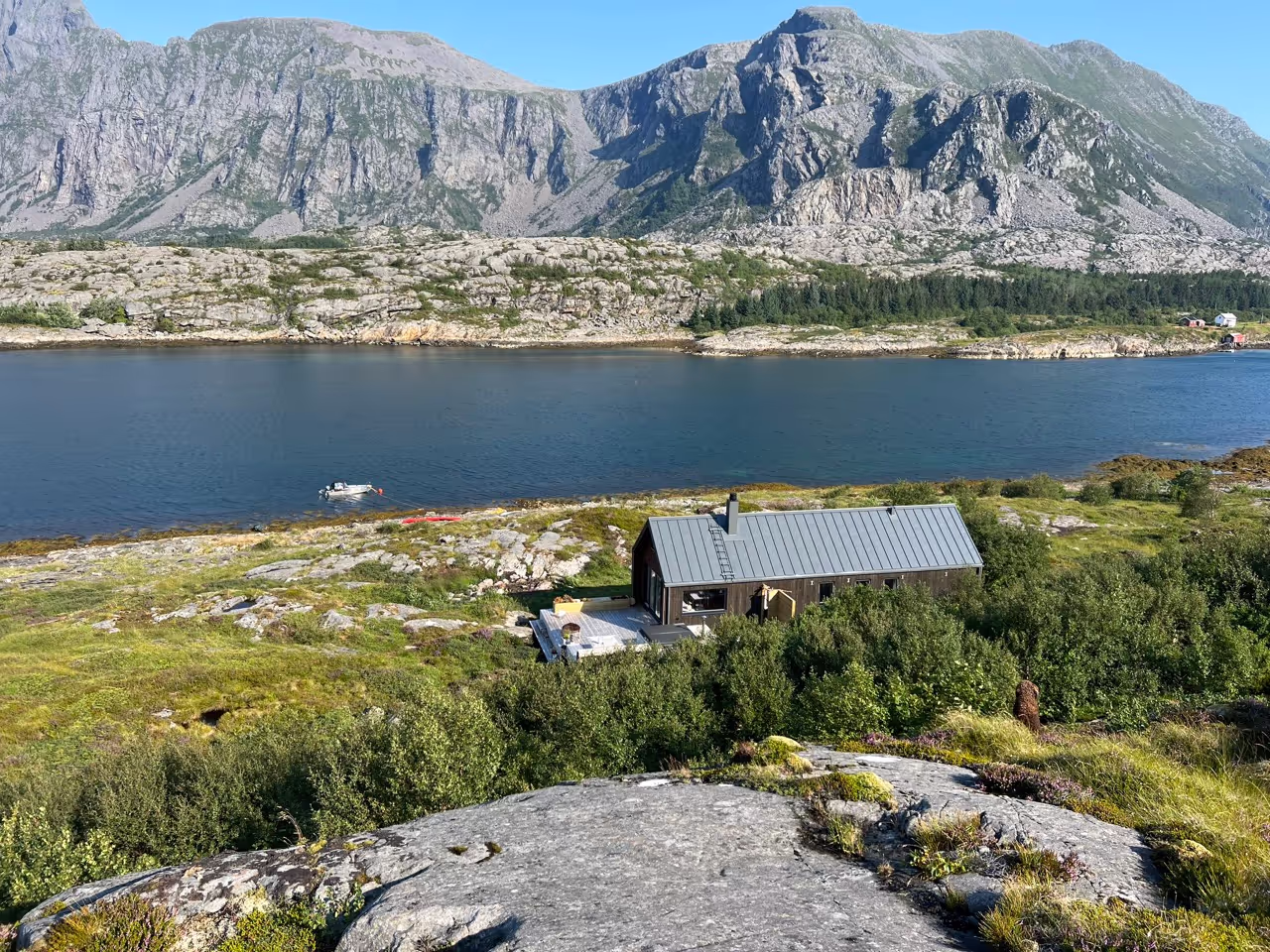 På sydspissen av øya Vega utenfor Brønnøysund har vi bygd om en eksisterende hytte. Den eksisterende hytten var inspirert fra gamle båthus men med sterkt avvikende dekor og fargesetting. Tiltakshavers ønske var å beholde hyttas eksisterende planløsning og geometri i stor grad, men ved hjelp av ett lite tilbygg på kun 25m2 utvide hyttas funksjonalitet vesentlig. Tilbygget inneholder bad, ett soverom og nytt funksjonelt inngangsparti organisert i forlengelse av hyttas lengderetning. Hytta har fått en knappere detaljering, og hyttas enkle saltaksfom er rendyrket og forsterket. Det er samtidig med etableringen av nytt tilbygg etablert en gjennomgående akse i hytta, fra nytt tilbygg i nord til eksisterende oppholdsrom og uteopphold i syd. Aksen bidrar både til å knytte hyttas funksjoner sammen, samtidig som den forlenger og forbinder det innvendige med landskapet og rommene på utsiden.